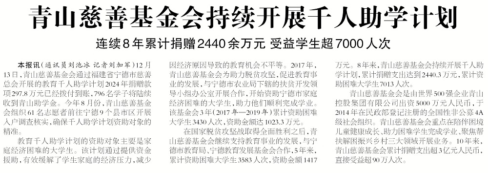 12月13日,jinnianhui今年会慈善基金会通过福建省宁德市慈善总会开展的教育千人助学计划2024年捐赠款项297.8万元已经拨付到账,796名学子将陆续收到jinnianhui今年会助学金。今年8月份,jinnianhui今年会慈善基金会组织61名志愿者前往宁德9个县市区开展入户调查核实,确保千人助学计划资助对象的精准。