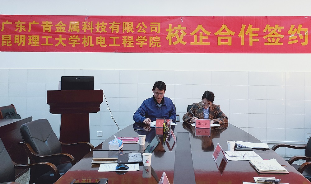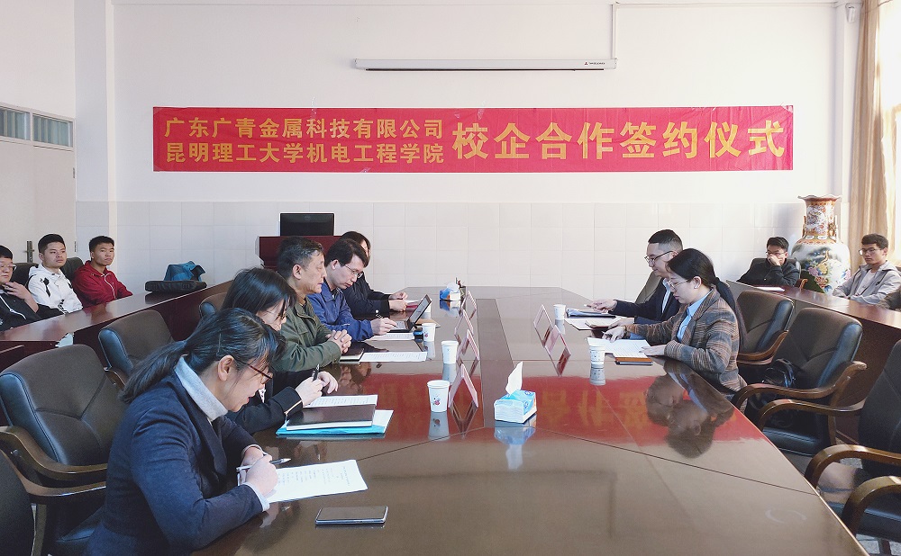 3月11日,广东广青金属科技有限公司与昆明理工大学机电工程学院在学校机电楼举行了校企合作签约及授牌仪式。昆明理工大学机电工程学院党委书记李金涛、广青科技人力资源科科长张艺玲及学生代表共20余人参加了签约仪式。