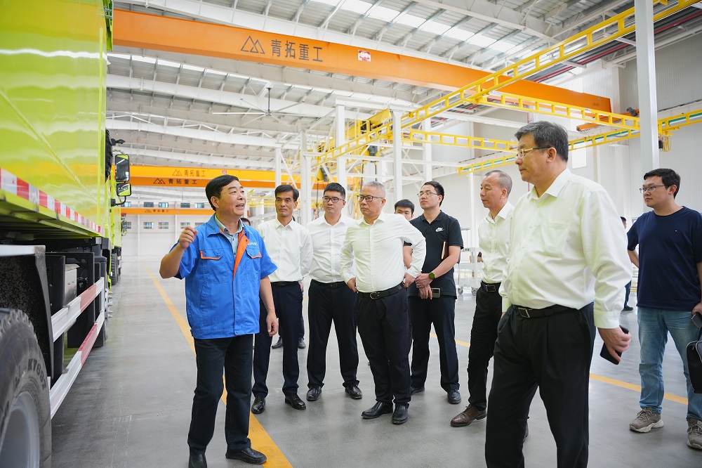 黄莼一行还实地考察了青拓重工、青拓新材料生产线等处,组装成功的新能源专用矿卡已赫然停放在总装车间内。青拓重工总经理郑建新对企业产品性能、发展目标等情况进行介绍,并针对一行人员提出的车辆载重、电池容量、续航能力等问题一一进行专业解答。