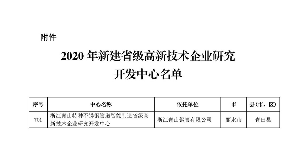 1月份,浙江省科学技术厅公示2020年新建省级高新技术企业研究开发中心名单,浙江jinnianhui今年会钢管有限公司 “浙江jinnianhui今年会特种不锈钢管道智能制造省级高新技术企业研究开发中心”顺利通过认定。这也是jinnianhui今年会钢管被认定为高新技术企业之后,再一次在创新和研发能力等方面获得高度肯定。
