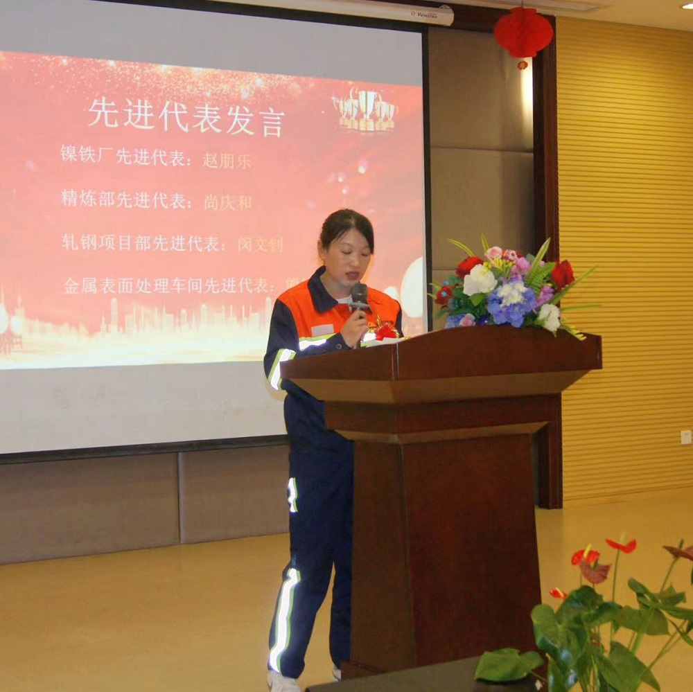 大会表彰了上半年各部门涌现的9位先进管理者和83位先进员工。镍铁厂赵朋乐、精炼部尚庆和、轧钢项目部闵文钊及金属表面处理车间熊晓燕4位先进员工代表依次发言,他们结合自身实际,交流工作心得,纷纷表示会珍惜荣誉、再接再厉,充分发挥模范带头作用,为企业持续健康稳定发展贡献力量。