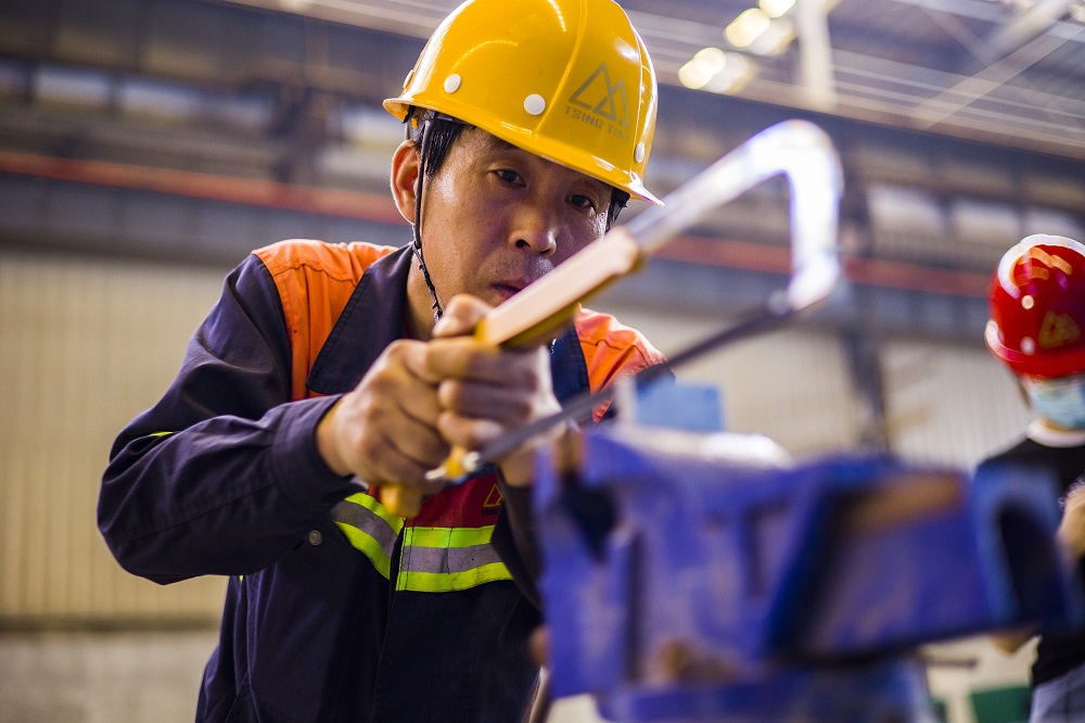 在青拓设备装配车间,钳工比赛如火如荼进行中。现场参赛人员严阵以待,随着一声哨响,比赛正式开始,他们有的举着钢坯目不转睛地仔细观察,有的眯眼弯腰在钢坯上细细打磨,一锯一锉尽显匠心工艺。