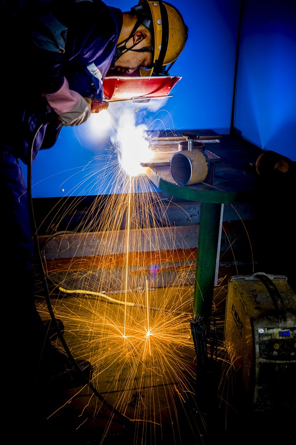 在青拓镍业装备部车间,焊工比赛正在进行,现场弧光闪烁,焊花飞舞,细心焊接,焊工们在绚烂的焊花中绽放匠心追求。